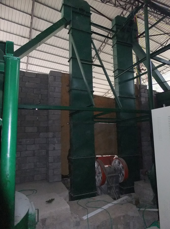 垂直斗式提升机,由运动部分(料斗与牵引胶带)、带有传动滚筒的上部区段、带拉紧滚筒的下部区段、中间机壳、驱动装置、逆止制动器等组成,适用于向上输送的粉状、粒状小块状的无磨琢性或半磨琢性散状物料,如煤、沙、焦末、水泥、水矿石等。本机的特点为快速离心式卸料:并采用橡胶输送带为牵引构件故不适于输送大块磨琢性及掏取力大的物料。被输送物料的温度不得超过60度,若采用耐热橡胶带允许150度。本机的输送能力为3.1-66立方米/小时,高度4-30米。为满足各种不同的要求。本机具有各种不同的制法和装法。